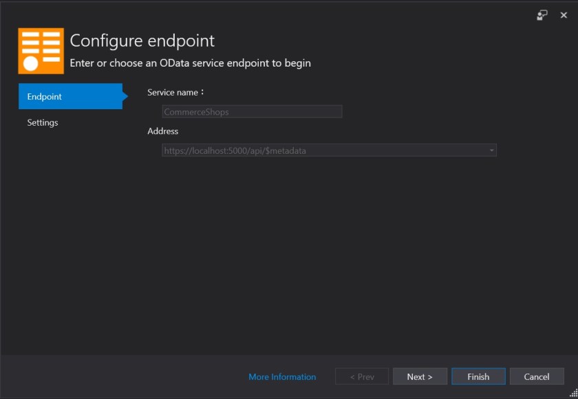 - Should see the following screen, hit finish. Ensure you have correct URL to your commerce engine. Repeat for “CommerceOps”.
